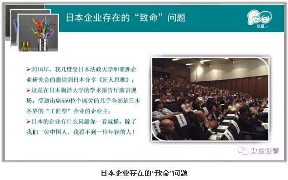 2016年,樓仲(zhòng)平曾幾度(dù)受日本法政大學和亞洲企業研究會的邀請到(dào)日(rì)本分享《匠人思維》。在分(fèn)享過(guò)程(chéng)中,樓仲平發現了一個(gè)很明顯的問(wèn)題,基本上來聽課學習的幾乎是60歲以上的日本企業主,幾乎看不見年輕人!究其原因,是(shì)由於極致的工匠精神讓日本(běn)的年輕人不願意接班。1995年以來的二十年間,日本中小企業經營者年齡(líng)峰值從47歲變成了66歲,到了2015年,人數最多的又變成了66歲,有23萬人。也就是說,日本中小企(qǐ)業領導(dǎo)人(rén)從中年人為(wéi)主變成了老年人為主,經營層老齡化成為日(rì)本中小企業的突出特征!