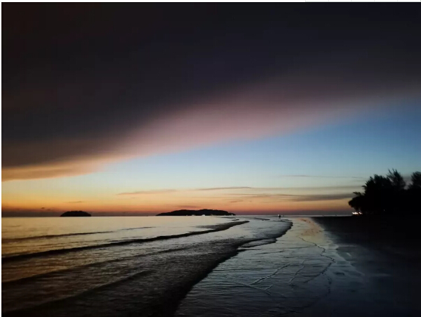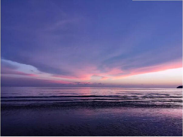 到了太陽快下山時,我們也回到了沙灘上。隻見一輪紅日慢慢向山那邊落下去,雲彩也被映襯得金(jīn)黃金黃的,倒映在水中的(de)光也讓人頭暈目眩,睜不開(kāi)眼。沒幾分鍾,太陽就下山了。就當我們覺得“世界上最(zuì)美的落日(rì)”也就是不過如(rú)此時,神奇的事發生了!太陽下山以後,刺眼的光芒也不見了,而留下來(lái)的雲朵開始了他們的表演,演變成了黃色、藍色、紫色,不斷變幻,像是打翻了顏料(liào)盤後幾種顏色混到了一起(qǐ)。瑰麗的雲層壓得很低,似乎和大(dà)海連到了一起,海天一色(sè)。此(cǐ)情此景(jǐng),讓每個人的心都變得柔軟起來。此時此刻(kè),無語也溫暖,平凡也浪漫。
