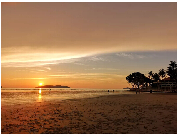 下午,就迎來了我們非常期待的丹絨亞路日落啦(lā)!我們駕駛著新租來的小車子(這輛車是我們去仙本那之前在機場租好的(de),價格比“小紅”略便宜一些(xiē),而且比“小紅”更高(gāo)檔(dàng),空間更(gèng)大,還是我(wǒ)喜歡的白色!),一路行駛到沙灘邊。當天天氣非常好,所以去看日落的人應該也很多,路上堵了長長的車隊,幸好我(wǒ)們出發得早,到達的剛(gāng)剛(gāng)好(hǎo)。看到網上推薦看落日的地點已經有好多(duō)人等(děng)著了,我們就朝著香格裏拉酒店的方向一直往前走,大概有一兩公(gōng)裏的樣子,到(dào)達了著名的香格裏拉酒店觀賞落日的(de)最佳地點——咖啡店邊上,人少,安靜,風景如畫,完美!天色還比較亮,溫度也挺高的,我們在海邊玩了一會,就趕緊到陰(yīn)涼處休息了。