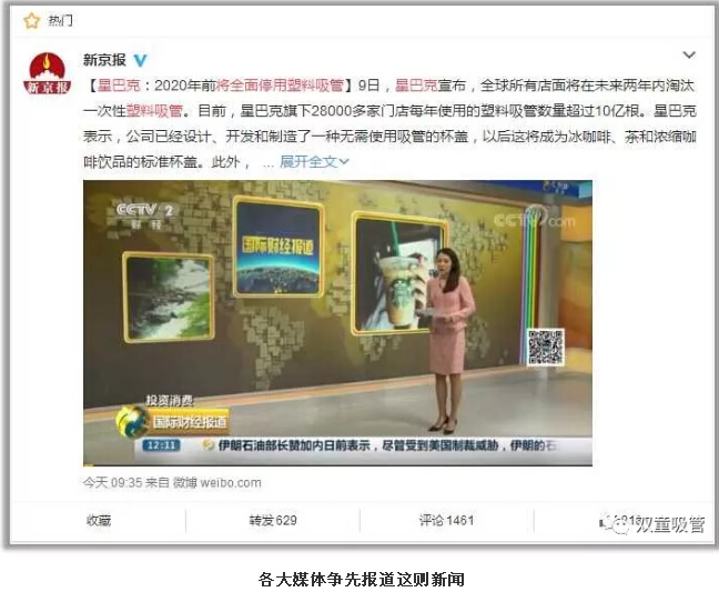 昨(zuó)天下(xià)午,一則#星巴克(kè)將全麵停用塑(sù)料吸管#的話題迅速登上了微博熱(rè)搜榜!中國日報、新京報、第一財經日報等各大官V不斷跟進這(zhè)個話題,連(lián)央視也發了新聞(wén),可謂是一“管”激起千層浪!