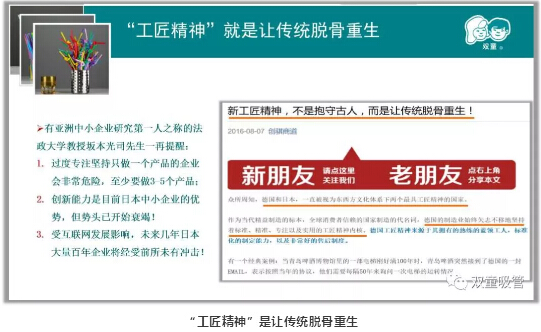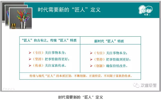 由此我提出,真正適合國內企業的“工(gōng)匠精神(shén)”,必須在(zài)前麵(miàn)加(jiā)上一個“新”字。這個(gè)“新”,就意味著加(jiā)入時代巨變的元素,加入“互(hù)聯網信息化(huà)高度對(duì)稱”的元素。