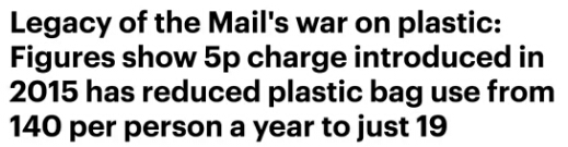 “根據數據顯示,自2015年推出對每(měi)個塑料(liào)袋征收5便士(約4.5毛)稅款法案後(hòu),英國的塑料袋使用量(liàng)從人均每年140個降至19個!”