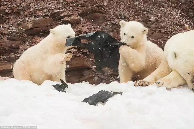 兩隻(zhī)小北極熊把一塊黑色塑料當成了玩具