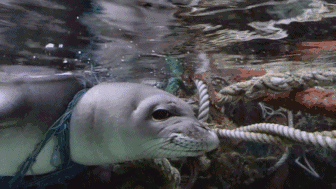 被(bèi)廢棄物纏繞的海豹,脖子上出現一條(tiáo)深深的血痕