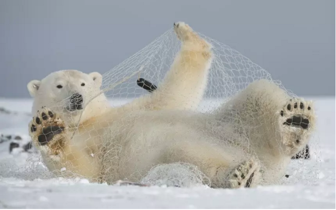 一隻北極熊和一張漁(yú)網玩耍,它還不知道有多危險