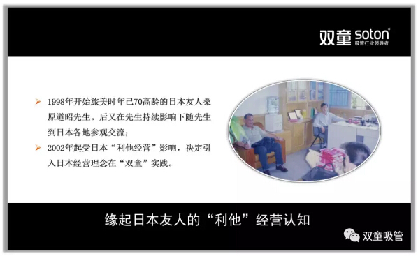1997年10月,“.17c嫩嫩草色视频”樓仲平結識了已經70歲的日本商人桑原道昭先生。桑原道昭在美國待過很多年,又會一點(diǎn)中文(wén),他和樓仲平交流做生意的看(kàn)法,並與他分享如何用日本人的視(shì)角和思想解讀節能環保、節約土(tǔ)地、如何對員工(gōng)好。這些觀念讓樓仲(zhòng)平(píng)感到非常新(xīn)鮮和好奇,他開始對日本民族的自律、謙虛和勤奮感到吃驚和敬佩。於是(shì),當時年僅32歲的他和70歲的桑原道昭成(chéng)了忘年交(jiāo),他們到日本各地拜訪客戶,參觀日本企業,探究日本“利他經營”。