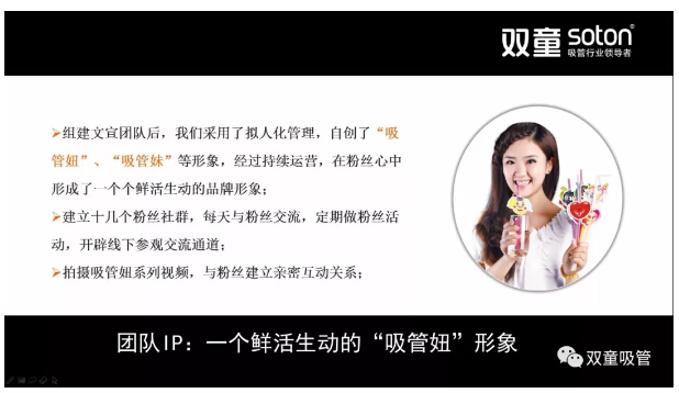 組建文宣團隊(duì)後,我們(men)采(cǎi)用了擬人化管理,自創(chuàng)了“吸管妞”、“吸管妹”等形(xíng)象(xiàng),經過(guò)持續運營(yíng),在粉絲心中形成(chéng)了一個個鮮活生動的品牌形象。同時,建立十幾個粉絲社群,每天與粉絲(sī)交流,定期做粉絲活動,與(yǔ)粉絲親密互動。