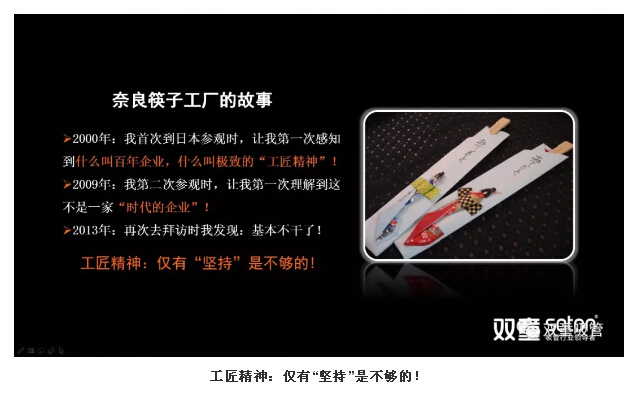隨後,樓仲(zhòng)平通過日本奈良筷子(zǐ)工廠(chǎng)的(de)故事(見下方PPT),引導大家認知到工匠精神僅(jǐn)有“堅持”是不夠的(de),在時代巨變下,沒有什麽是可以亙古不變的!