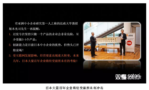 有“亞洲中小企業研究第一人”之稱的法政大學教授阪本光(guāng)司先生曾經在和樓仲平交流中表示:過度專注堅持隻做一個產品的企業會非常危險,一個企業(yè)想要長續生存發展至少要(yào)做3-5個產品。創新能力是目(mù)前日本中小(xiǎo)企業的優勢,但勢頭已開(kāi)始衰竭(jié)!受互聯網發展影響,未來幾年日本大量百年企業將經受前所未有的衝擊!