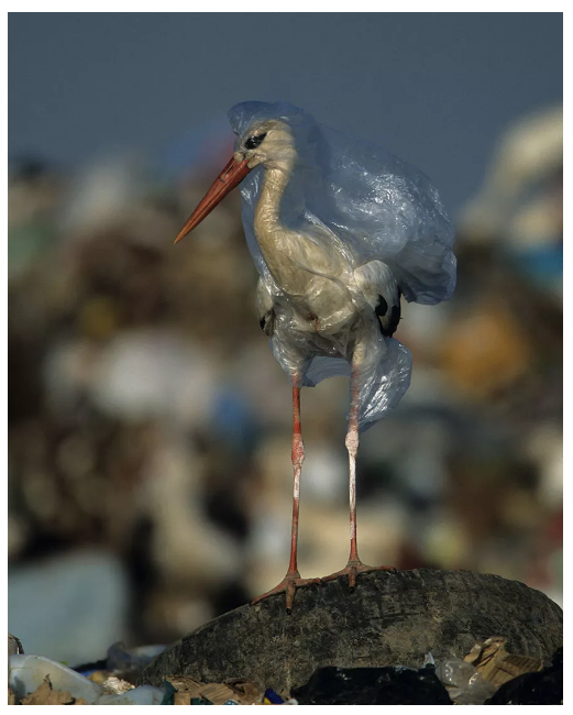 一隻鸛周身被塑(sù)料袋纏繞,擺脫不得,