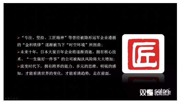 樓仲平(píng)分享道:“工匠精神”來源於日本(běn),是一種骨子裏的敬業和(hé)守業精神。它是日本民族中人(rén)格文化的體現,完全靠學是學不會的。“工匠精神”傳入中國後(hòu),通(tōng)過政府、社會的推動已經成為一(yī)種口號、一項運(yùn)動、一種共識(shí)。我們要意(yì)識到任何一項事物一旦被社會所號召,如果創業者沉迷其中,就沒有企業經營中的差異化所在。