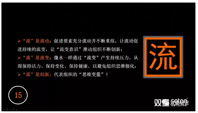 第二個字是“流”。在高速變(biàn)化的時代,資源(yuán)和信息高速流變,人才高度流動……在這樣的大環境下,企業發展呈現出一種不可預測的情況。作為行業細分(fèn)的領先企業,你應該通過主動的方式、迎合(hé)的方式、應變的方式、創新的方式,從(cóng)而保持企業有序流動,保持創新。