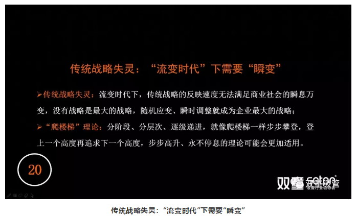 另一個觀點,我認為在(zài)一個流變的時代下,由於信(xìn)息的高速迭(dié)代,傳統戰略已經失靈。意思就是在流(liú)變時代下,傳統戰略的反(fǎn)映速度無法滿足商業社會的瞬息萬變。所以,沒有(yǒu)戰略有可(kě)能是企業最好的戰略。