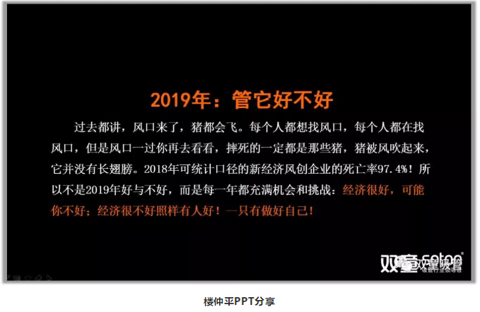 首先,樓仲平(píng)以(yǐ)“2019,最近十年(nián)最難的一年,未來十年(nián)最好的一年”一句話展開分(fèn)享,並引導(dǎo)大家認知:改革(gé)開放四十年,好做的、能(néng)做的(de)、輕輕鬆鬆、容易做的都給我們(men)做完了。環境逆轉下、紅利消失下(xià),留下給我們的當然會越來越難做。所以,在這個時代(dài)下,做什麽並(bìng)不(bú)是(shì)那麽重要,重要的是(shì)要怎麽做。我們感受到一定是(shì):“逆風”中(zhōng)行進!