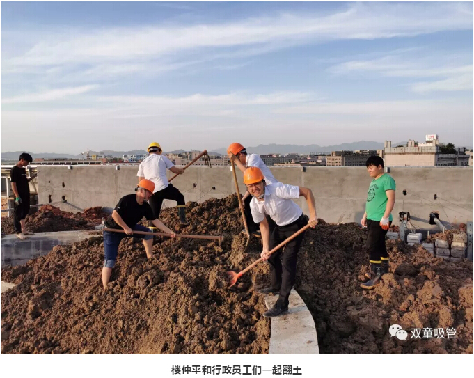 課程直播結束後,樓仲平再次來(lái)到新廠房工(gōng)地進行(háng)巡查。在看到新廠房(fáng)屋頂花園的土方堆的太(tài)高,容(róng)易產生安全隱患時,樓(lóu)仲平馬上召集了部分行政(zhèng)人員(yuán)應急(jí),大家一起拿起鏟子開始鏟土,及時解決土方過高問(wèn)題。看來,樓大大真是快變成包工頭啦(lā)!