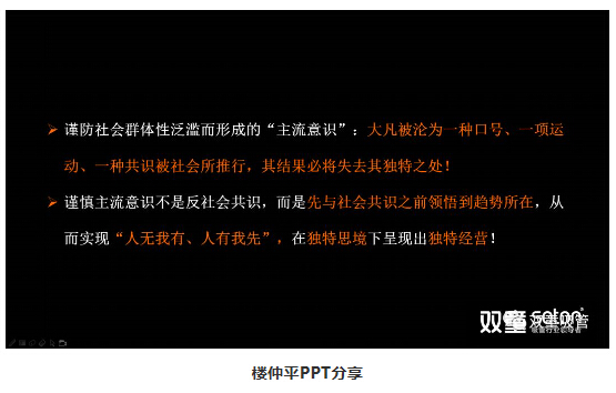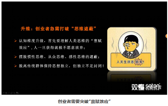 接著,樓仲平通過“稟賦效應”的案例講述,讓大家理解到人一旦獲(huò)得就不願意放棄,思想一旦陷入舊的傳統範式中,就極難(nán)轉換到新的思維範式中去。因此,創業(yè)者需要打破慣性(xìng)思維、從眾思維、感性思(sī)維的(de)“思維遮蔽”,突破“稟賦效應”,脫離傳統群體保持思想獨(dú)立,從(cóng)而實現認知升維(wéi)!