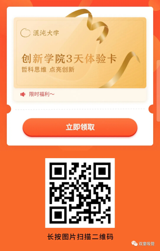 如果你還沒有聽(tīng)說過混沌,如果你還持觀望態度,沒關(guān)係,我們為大家爭取到了混沌大學最核心項目——創新學院的三天免費體驗卡,隻要你掃碼下圖,即可享受為期3天的創新學院學籍!