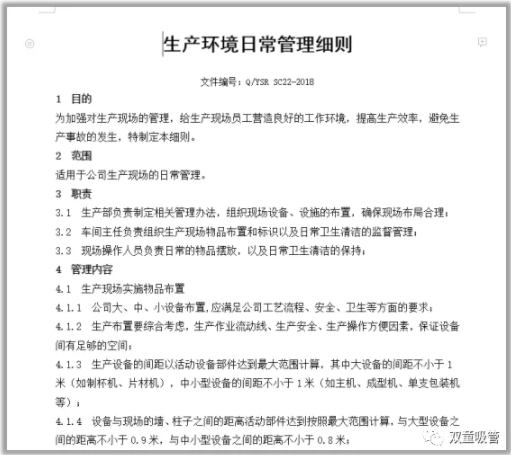 除(chú)了優質生產環境之外,我們也有一係列的製度文件支撐!為了加強環境的衛生管理,我們建立(lì)了完善的(de)衛生保障體係(xì)支撐(chēng),明(míng)確生產過程中的(de)衛生保潔和操作規程的要求,確保生產的產品衛生和質量指標符合國家相關規定要(yào)求!