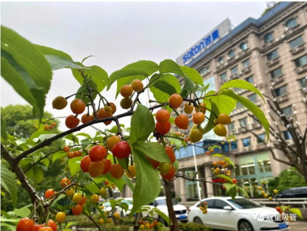 四月(yuè),最初成(chéng)熟的就(jiù)是櫻桃了,由青轉黃,由黃轉橙,最(zuì)後變成紅(hóng)色,一團團、一簇簇如紅寶石一般掛在枝頭,酸甜誘人!