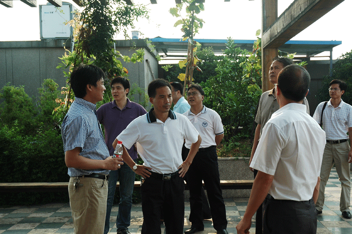 上圖:樓仲平陪(péi)同考察公司屋頂花園和循環用水情況