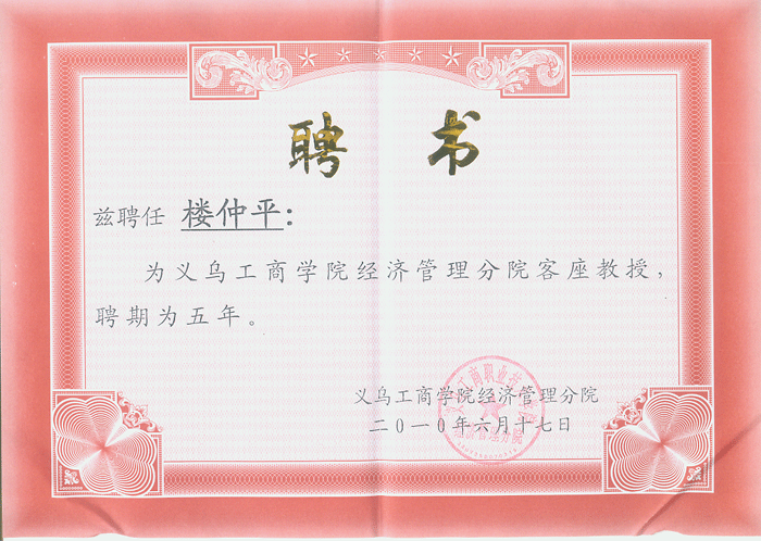 上圖:義烏工商學院(yuàn)授予董事長(zhǎng)樓仲平先生客座(zuò)教授聘書