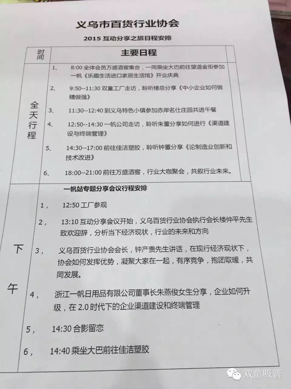 上周六(liù),義烏百貨協會舉辦了一場企業互動之(zhī)旅,四十多(duō)名百貨行(háng)業的企業家們自發組隊,在行(háng)業協會的各位領(lǐng)導人帶領(lǐng)下,參觀了幾家行業龍頭企業,相互交流企業經營管理經驗,促進企業的共同(tóng)發展。這是吸(xī)管(guǎn)妞偷拍的當天行程(chéng)表,給大家透露一下!