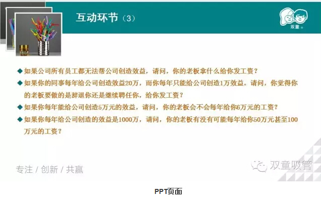 這次的學習會,吸管(guǎn)妞變身講師,和大家聊聊《誰給你發工資》。這不(bú),一開場,吸(xī)管(guǎn)妞就和大家互動了起來,是誰給你發工資呢?