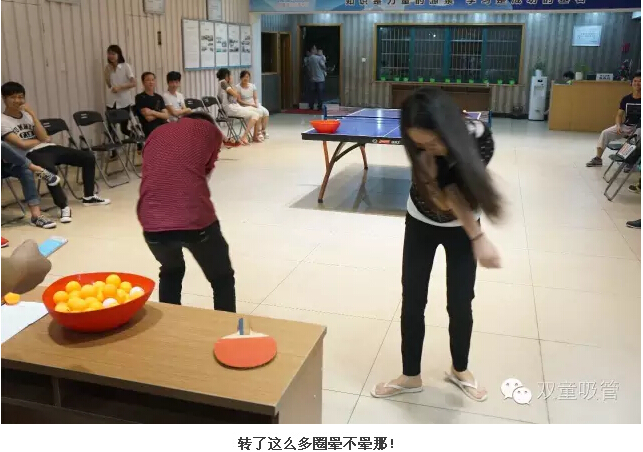 別急(jí)!先來玩玩小遊戲。瞧!捏鼻子 轉大象、定點投乒乓球等遊戲層出不窮。大夥運球之前必須先轉(zhuǎn)上5圈,哎呀!還沒拿起球拍運(yùn)球,就(jiù)暈在乒乓球桌上了!逗得在場觀眾們都捧腹(fù)大笑!