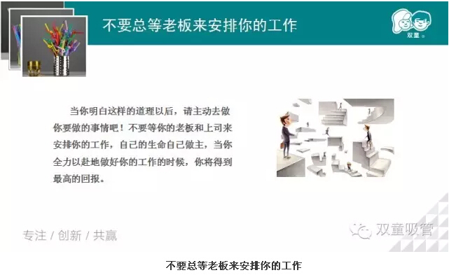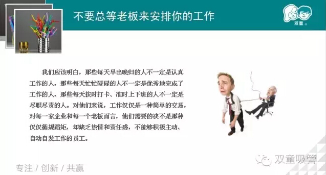 接下來(lái),李講師又從不要總等老板來安排你(nǐ)的工作進行講(jiǎng)解。是啊!我們應(yīng)該主動(dòng)去做事情,而不是等(děng)你的(de)老板和上司來安排你的(de)工作。