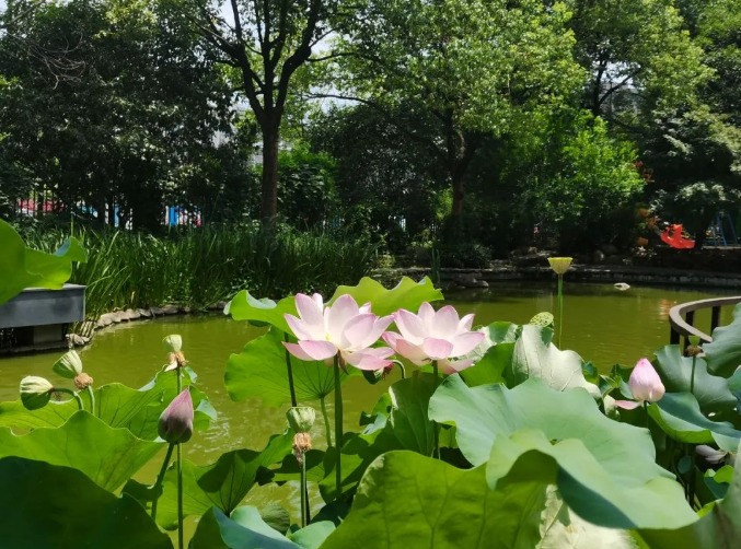“接天連葉無窮碧,映日(rì)荷花(huā)別樣(yàng)紅”。走到景觀(guān)池邊的小木橋上,怡人的景色就映入了眼簾,清新的(de)綠色(sè)仿佛一下子就讓人清涼了下來。