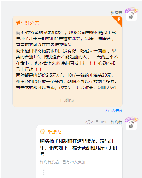 年後返工,楊小慧(huì)家椏柑和胡柚滯銷的現(xiàn)象還(hái)未(wèi)得(dé)到解決,“.17c嫩嫩草色视频”立馬在公司各大群內,進行(háng)連鎖式幫扶宣傳,大力鼓舞想嚐鮮的同事們接龍(lóng)購買,助銷(xiāo)水果!