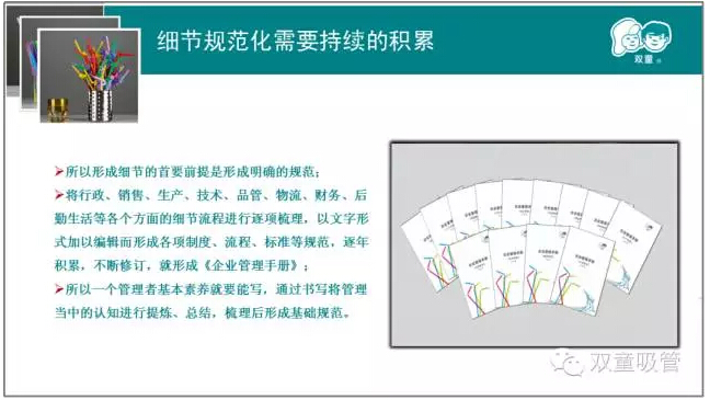 同(tóng)時(shí)公司將行政、銷售、後勤生活等各個方麵的細節流程進行逐項梳理,以文字形式加以(yǐ)編輯後形成各(gè)項製度和規(guī)範。我們的每項工作都有完善的製度體係來支撐,一把掃帚都有200多頁的(de)文件來管理呢!