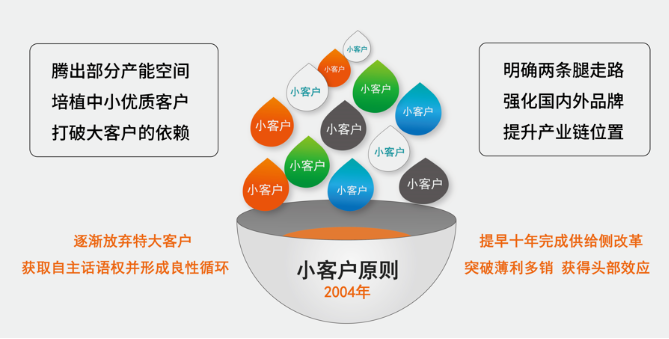 危機之下,2003年,董事長樓仲平經過長時間思想博弈,明確提出“小客戶原(yuán)則”,逐步放棄(qì)沒有利(lì)潤的(de)大客戶,培植日本和歐盟的中小客戶,以及拓展國內高(gāo)端市場和個性化定製,形成“兩條腿走路”,牢牢掌握了“童”經營的主動權。