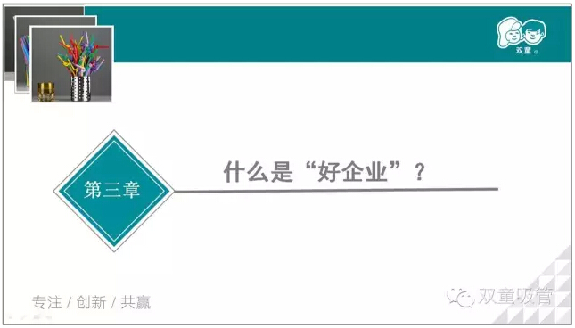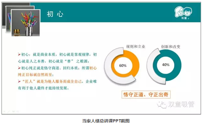“初心”就是堅守初(chū)心,恪守商道,回歸本質。例如,2003年,“雙(shuāng)童”進行了第一次五(wǔ)年發展規劃,放棄了大客戶,實行小客戶原則。這就是(shì)因為我們的初心純正,所以能夠在複雜情況(kuàng)下堅定地做出正確的選(xuǎn)擇。