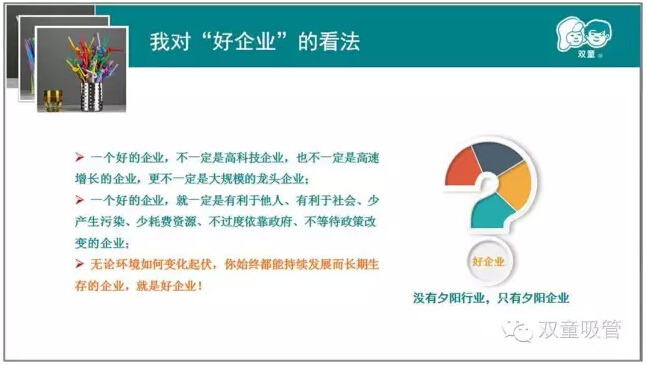 何為(wéi)好企業?當家人樓總和大家分享:“別人好(hǎo),你好;別人不好(hǎo),你還好(hǎo)!”做一個好企業一定要有利(lì)於他,有利於社(shè)會(huì)。少浪費資源,少產生汙染,不過分依靠(kào)政府,不等待政府變化。一定要創造價值,無論環境如何變化起伏,始終都能持續(xù)發展,長(zhǎng)期生存!