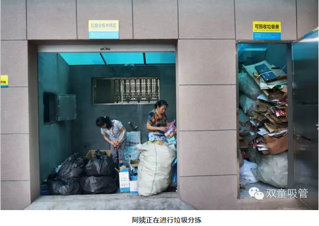 接下來,就是對(duì)收集(jí)好的(de)各類垃圾進行分類分揀處理工(gōng)作。在我們的垃圾分揀房,每(měi)天都有兩(liǎng)位阿(ā)姨負責垃(lā)圾的分揀工作。把可回收利用的紙板、塑料瓶等放到“可(kě)回收垃圾房”後(hòu)一起出售,把不(bú)可回收的生活垃圾放到“不可回收垃圾房”一(yī)起運出。
