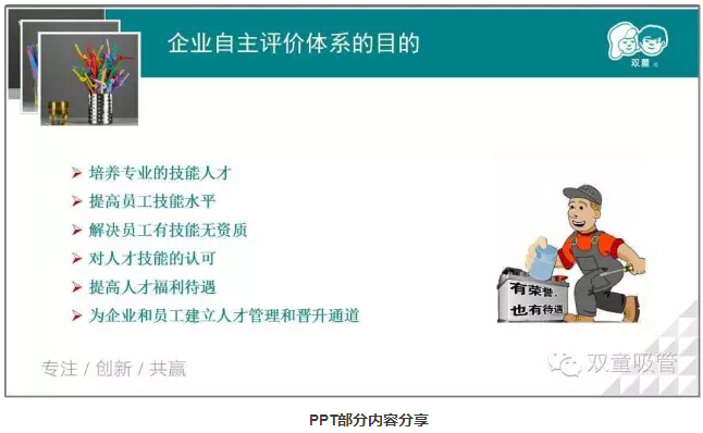 通過企業自主評價體(tǐ)係,員工們可以(yǐ)對照該(gāi)體係,努力提升(shēng)自己的技能,解(jiě)決工作(zuò)上的難題。而作為公司來說,以後(hòu)在(zài)評價(jià)員工的工作技能水平上,將有一個標準的評判依據,大大有助於對員工的技能培訓,使其(qí)“茁壯成長”全麵提升,留住真正的(de)人才!