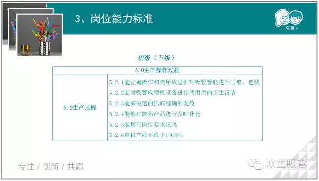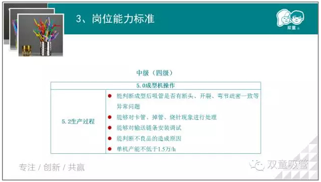 接下來,我們將根據吸管成型工的(de)標準體係,對(duì)吸管成(chéng)型工崗位(wèi)的初級、中級、高級等五個等級進行(háng)劃分,鼓勵員工們進行報考職(zhí)業等級證書(shū),提(tí)升自我(wǒ)!