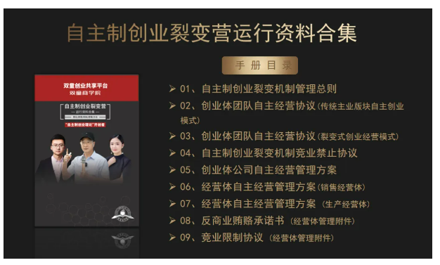 3)組織治理(lǐ)模塊:《自主製創業裂變營》專注於組織機製創新,幫助學員輸出一套企業組織創新(xīn)方案,激發個體活(huó)力,推動企業裂變式增(zēng)長。