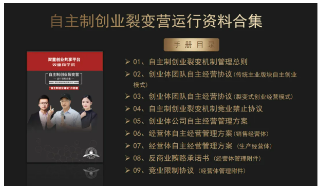 3、交付(fù)自主製創業裂變模式的各項規則、文(wén)本、合同等(děng)書(shū)麵資料