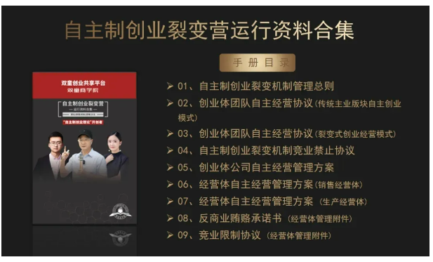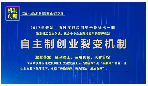 於是他果斷選擇破界(jiè)創新,尋求企業發展的“第二曲線(xiàn)”,並結合多種組織機製和(hé)中小企業的特點,自製了一套適用(yòng)於中小企業的組織創(chuàng)新製度——自主製創(chuàng)業(yè)裂變機製,搭建創業共享平台,激發員工從“要我做(zuò)”到“我(wǒ)要做”。