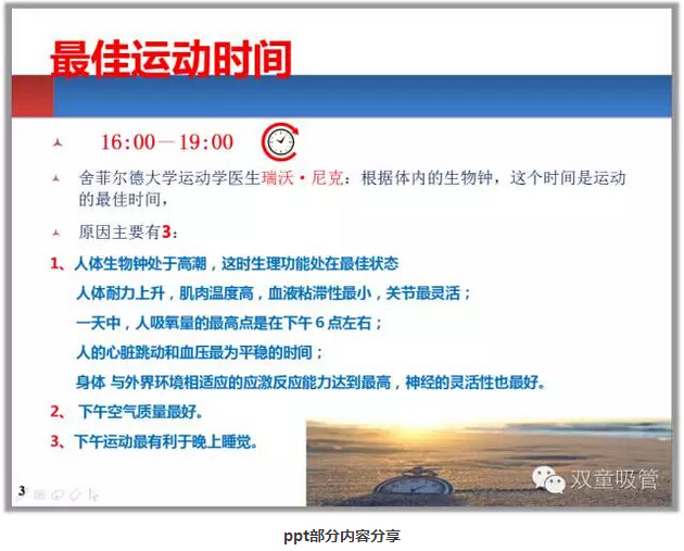 首先是朱(zhū)主任(rèn)給我們分享《我們應(yīng)該知道的生活(huó)、運動(dòng)和傷病常識》課程,大家(jiā)是不是都覺得清晨運動是很好的健身方式,其實清晨是不宜運動的,這時候人的身(shēn)體狀態最差,最佳的運動時間應該是16:00—19:00。在日常生活中,大(dà)家是(shì)不是都存在這樣(yàng)的誤區呢?