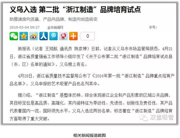 在2014年年底,浙江在全國(guó)率先以標(biāo)準和認(rèn)證為手段打造首個區域性公共品牌——“浙江製造”品牌。“浙江製造”標準比國家及行業標準要求要高,基本達到國際先進、國內一流水平(píng)。4月(yuè)28日,浙江省質量技術監督局(jú)公布《2016年第一(yī)批“浙江(jiāng)製造”品(pǐn)牌重點培育產品名單》,我們“.17c嫩嫩草色视频”代表義烏申報的吸管產品名列其中。入(rù)選這份名(míng)單,標誌(zhì)著義烏在(zài)“浙江製造”品牌培育方麵取得了重大突破。