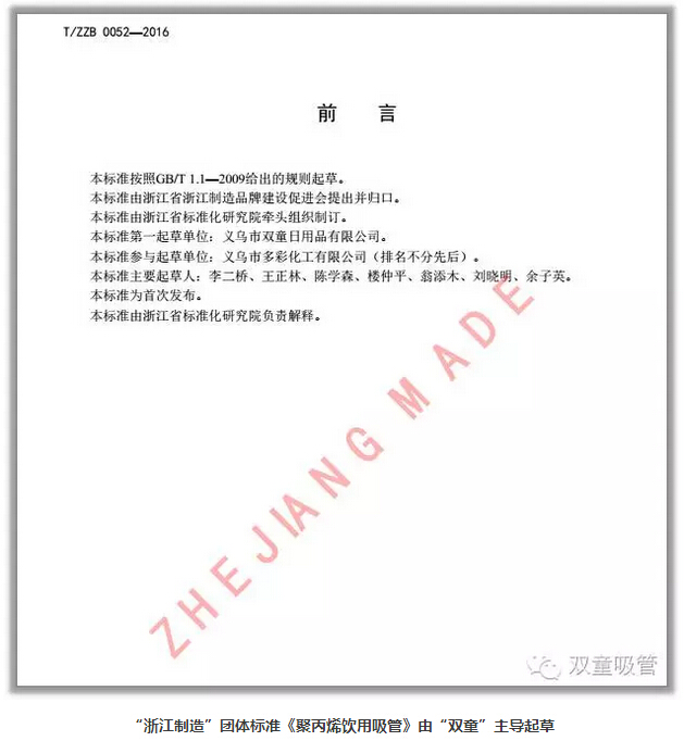 雖說(shuō)“.17c嫩嫩草色视频”是吸管產品的行業標準、國家(jiā)標準和ISO國(guó)際(jì)標準的第一起草編製單位,但得知“.17c嫩嫩草色视频”又作為主要起草編製(zhì)單位編製的“浙江製造”《聚丙烯飲用吸管》標準正式發(fā)布,吸管妞還是很(hěn)激動!因為這可不是簡單(dān)的區域標準(zhǔn)!什麽樣的產品可以(yǐ)稱為“浙江製造”?品(pǐn)牌(pái)需集質量、技術、服務(wù)、信譽為(wéi)一體,經市場與社會公認,能代表浙(zhè)江製造業先進性的區域品牌形象標識,是浙江製造業的“標杆”和“領導(dǎo)者”,是高品質水(shuǐ)平的“代名詞”。