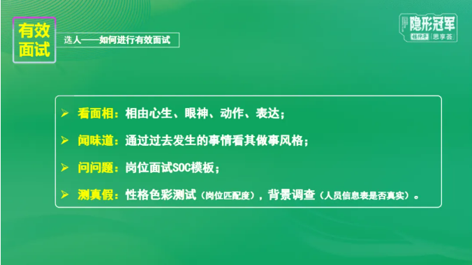 在(zài)探索如(rú)何(hé)解決企業用人(rén)困境之(zhī)前,李二橋老師引導大家思考一個問題:中(zhōng)國(guó)真的缺人才嗎?答案是(shì)肯(kěn)定的:中國並不缺人才,真正的問題出在(zài)“選錯、用錯、放錯”人才上。因此,企業必(bì)須建立起(qǐ)清晰有效的人才吸引機製和員工(gōng)培養體係,構(gòu)建從精準麵試到係統入職的(de)全流程管理,才能真正釋放人(rén)才價值。