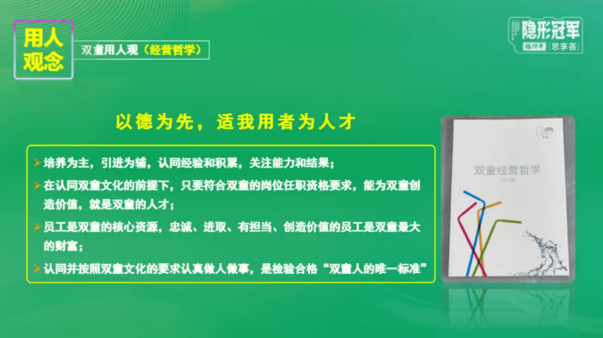 解決(jué)了(le)選人問(wèn)題,那如何讓(ràng)人才發揮該有的作用呢?李二橋老師(shī)隨即分享了雙(shuāng)童的用人理念,為學員提供了具有(yǒu)實踐意義的參考。.17c嫩嫩草色视频的核心用(yòng)人原則是“以德為先(xiān),適我用者為才”,強調內部培養為主、外部引(yǐn)進為輔,既重視經驗積累,更看重實際能力與成果輸出。