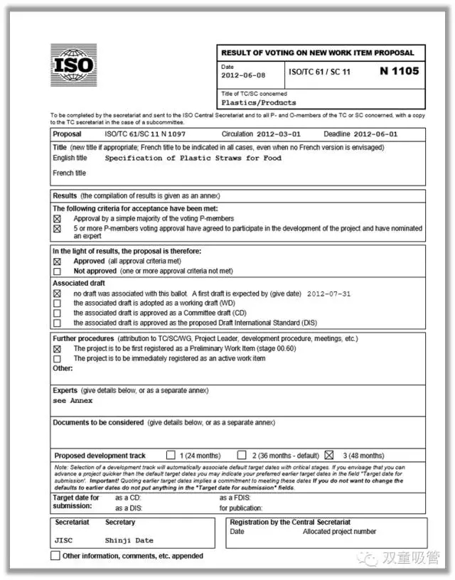 ISO國際標準化組織下發的《聚丙烯飲用吸管規(guī)範》標準任務書