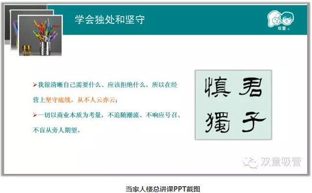 由此可見,盲目地交(jiāo)朋友,拉關係隻會導致自己越來越累,最後還是不能把事情做好。當家人樓總曾經在(zài)他的課件裏這樣說(shuō),我很清晰自己需要什麽,應該(gāi)拒絕什(shí)麽,所以在經營上堅守底(dǐ)線,從不(bú)人雲亦雲,不追(zhuī)隨潮(cháo)流,不響應號召(zhào)、不盲從旁人期望。