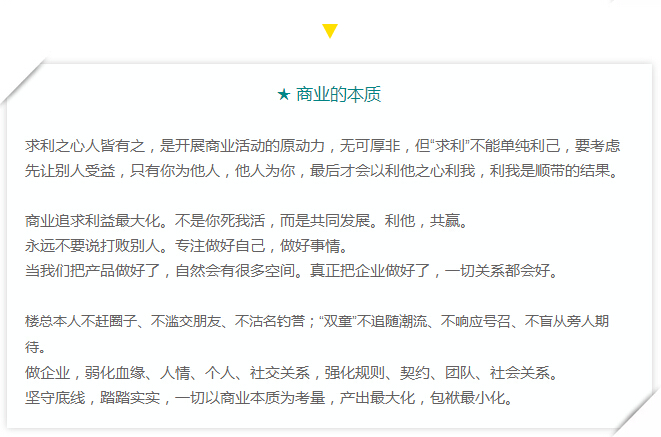 摘(zhāi)選部分筆記,濃縮的語句後是(shì)豐厚的經驗(yàn)和感悟,值得思索。在看我的筆(bǐ)記之前,不妨想一想,然後寫(xiě)下你對這樣幾個概念的理(lǐ)解:商業本質;匠人之心。閱讀中再與樓總所說對照(zhào)思(sī)考,收獲會更多。