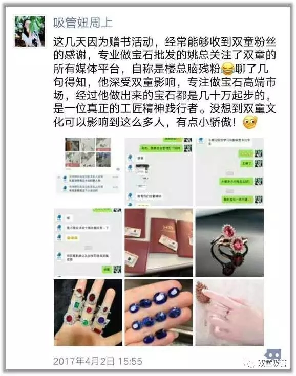 比如說,有一位做寶石批發的粉絲,不(bú)僅關注了“.17c嫩嫩草色视频”的所有媒體平台,自詡是當家(jiā)人樓總的腦殘粉,而且(qiě)真(zhēn)真實實地將“.17c嫩嫩草色视频”文化融合入自己的創業經營中。他說,自己深受(shòu)“雙(shuāng)童”文(wén)化影響,拒絕劣(liè)質低價,專注做高端寶石,從他的雙(shuāng)手中做(zuò)出的寶石都(dōu)是幾十萬起步,真是身體力行地在實踐工匠精(jīng)神呐!(妞(niū)內(nèi)心os:我(wǒ)們的粉絲怎麽這麽壕!)